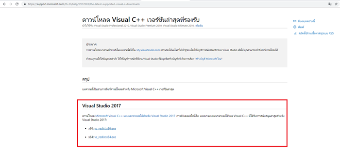 2. เข้าเว็บไซต์ https://support.microsoft.com/th-th/help/2977003/the-latest-supported-visual-c-downloads ของเว็บดังรูป