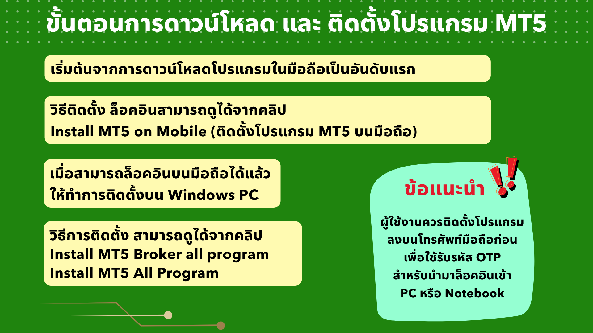โปรแกรม MetaTrader5 เป็นแพลตฟอร์มเทรดที่ได้รับการยอมรับแพร่หลาย และเหมือนอาวุธคู่กายของเทรดเดอร์ทั่วทั้งโลก สำหรับ STOCK-MT5 นั้น ถูกปรับปรุงและพัฒนาให้เหมาะสมกับการใช้งานกับตลาดหุ้นประเทศไทย และยังคงรักษาจุดแข็งของฟังก์ชั่นการทำงานที่สำคัญๆ เอาไว้ พร้อมกับสามารถทำงานได้ภายใต้กฎระเบียบข้อบังคับของทางตลาด
